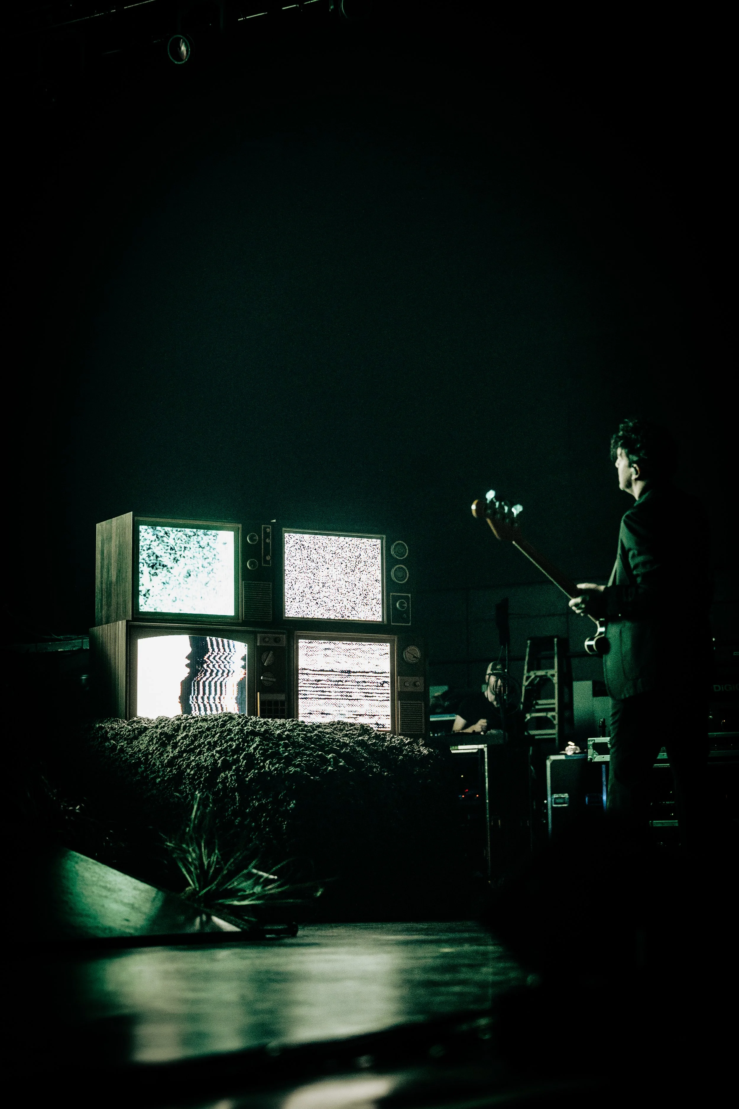 A telephone booth, an illuminated jukebox, cascading hills, and old western playing on staticky vintage televisions is only a glimpse at the gorgeous stage design Lord Huron stepped onto in Irving, TX on October 27 at Toyota Music Pavilion.